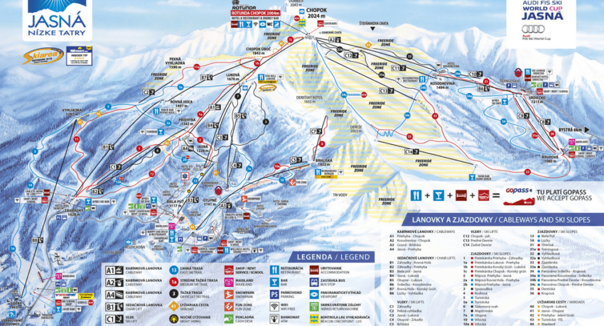 Największy w tej części Europy ośrodek narciarski – Jasna Tatry Niżne: Chopok (2024 m n.p.m.), 49 km tras – 11 km czarnych nartostrad dla zaawansowanych, niemal 26 km dla średnio zaawansowanych i 12 km łatwych, niebieskich tras; 30 km nartostrad naśnieżanych 5 miesięcy w roku; 30 wyciągów i kolejek linowych (w tym 5 gondolowych), które są w stanie przetransportować prawie 35 000 osób na godzinę. Pierwszego dnia odwiedzimy stoki w ośrodku narciarskim: Ski Park Kubińska Hola, 14 km tras, 2 wyciągi krzesełkowe, 8 wyciągów orczykowych lub Park Snow Donovaly, 11 km tras, 2 wyciągi krzesełkowe, 14 wyciągów orczykowych