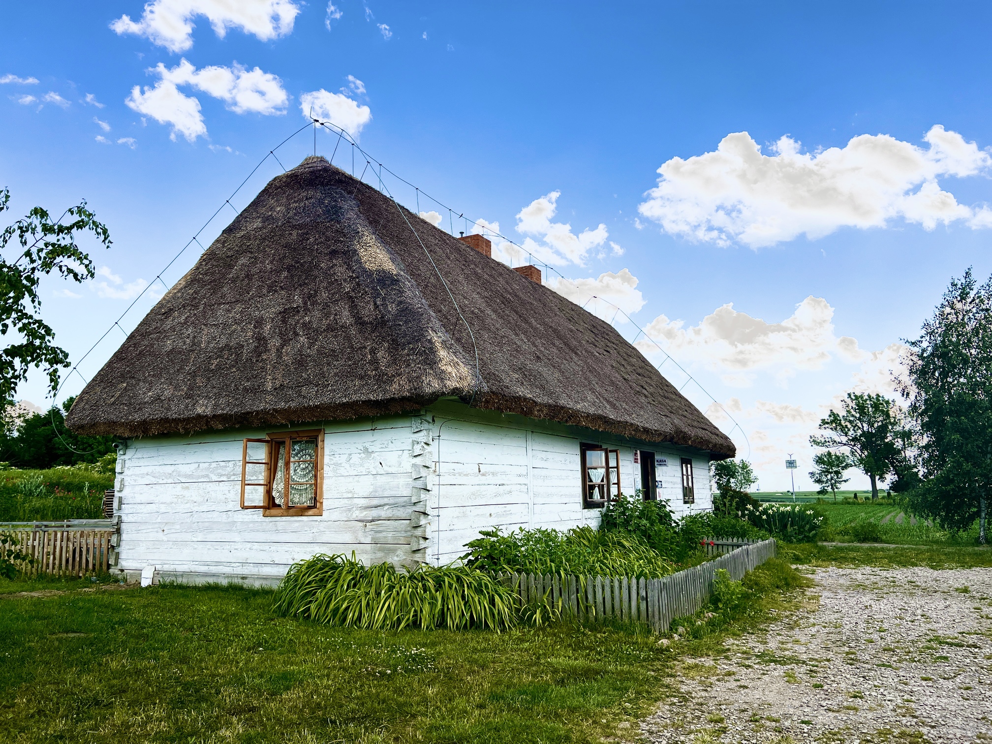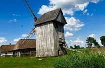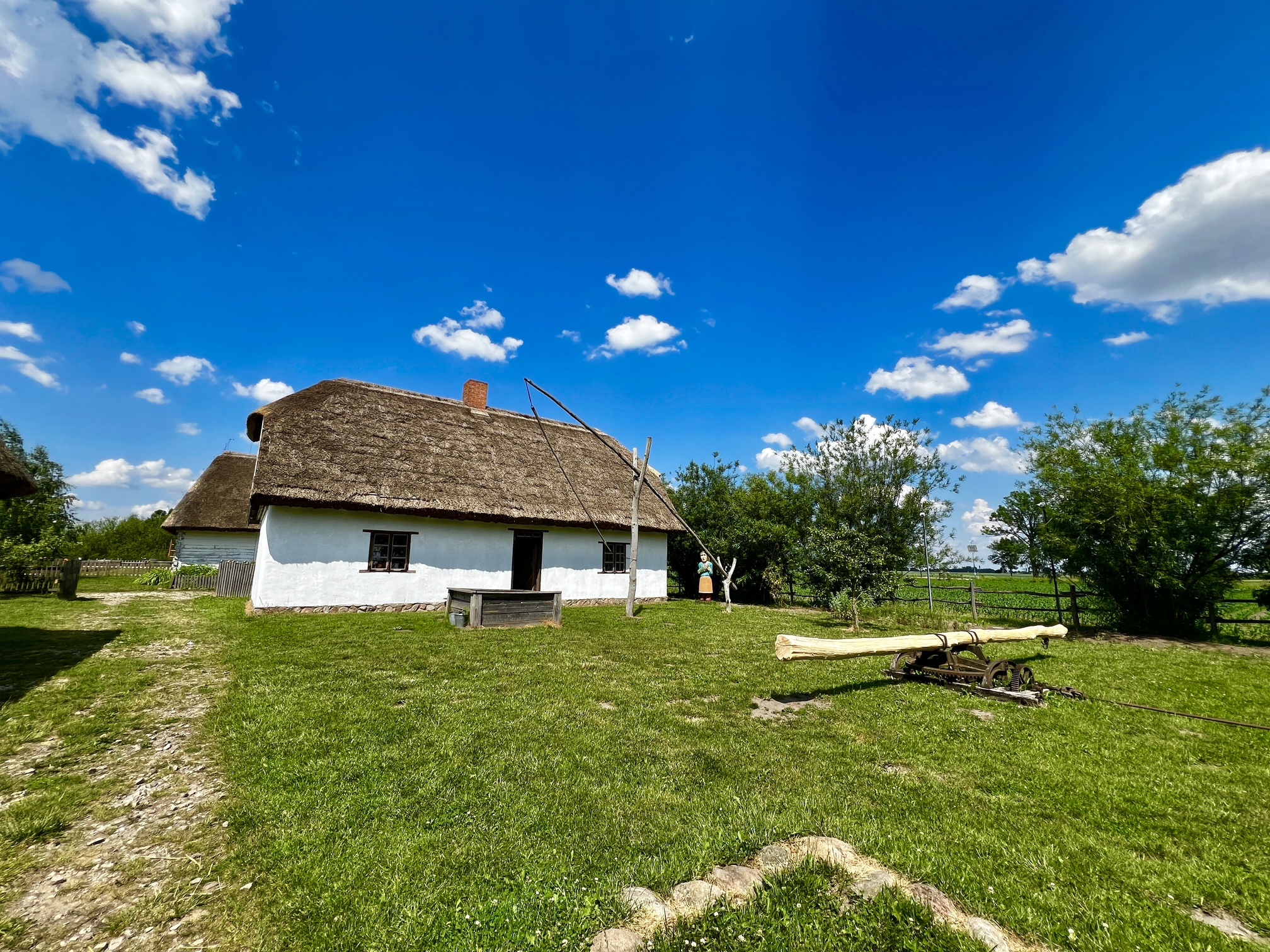 Skansen w Kwiatkówku. Kilka budynków i piękny wiatrak koźlak uzupełnione stawem powstały w 2013